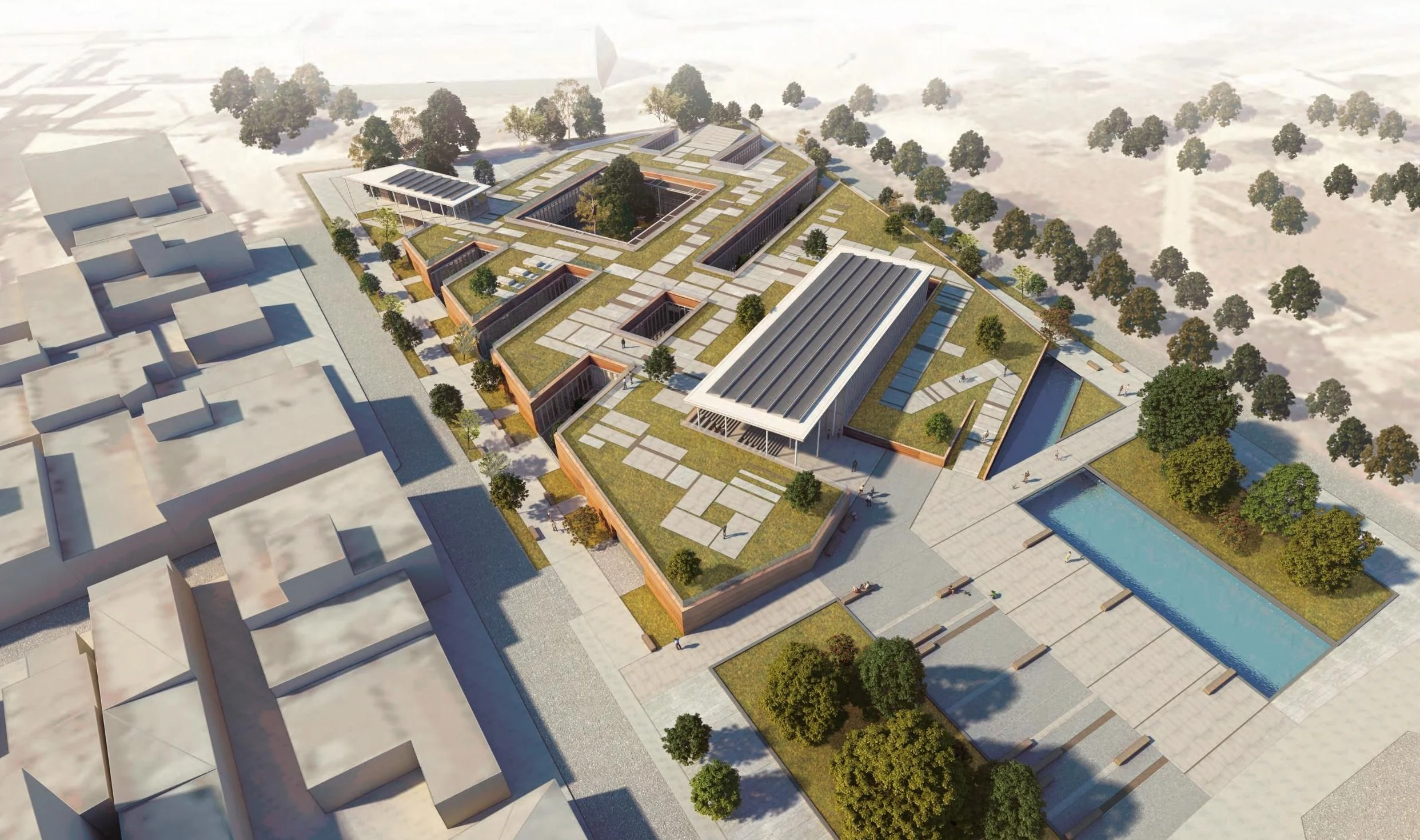 Because the land sits right next to an archaeological site, our approach was to design the entire building as low as possible and on one level around a series of courtyard for maximized natural light. A public park was placed on top allowing residents to enjoy a new green open air space that provides a lot of serene opportunities.